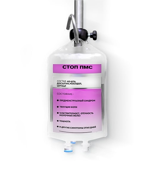 ПМС, месячные и все неприятности, что с этим связаны. Помогает снять тянущие боли внизу живота и болезненные, чувствительность и отечность молочных желез, дискомфортные ощущения по всему телу, головные боли, вернуть эмоциональную стабильность, аппетит, бодрость, снять температуру. Эффекты наступают уже через 30 минут после капельницы.